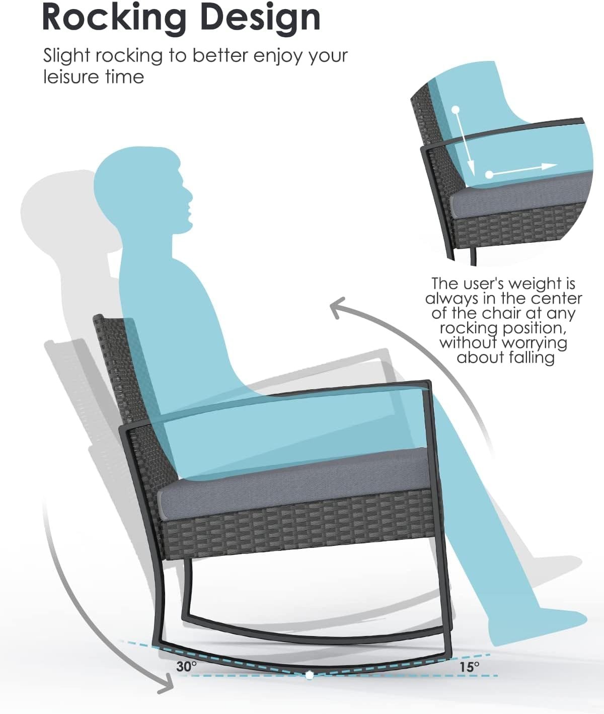 Imagine relaxing in your own cozy outdoor oasis with the 3 Pieces Wicker Patio Furniture Set. This modern rocking conversation set is not only stylish, but also perfect for any outdoor space, whether it’s a porch, garden, or poolside. The set is made with high quality materials, including PE rattan wicker and a sturdy metal frame, ensuring durability and the ability to withstand any weather changes. With comfortable cushions and a convenient tempered glass table, you’ll be able to enjoy leisure time with friends and family in ultimate comfort. Plus, the lightweight and compact design makes it easy to move and assemble. Upgrade your outdoor space with this amazing patio furniture set today!