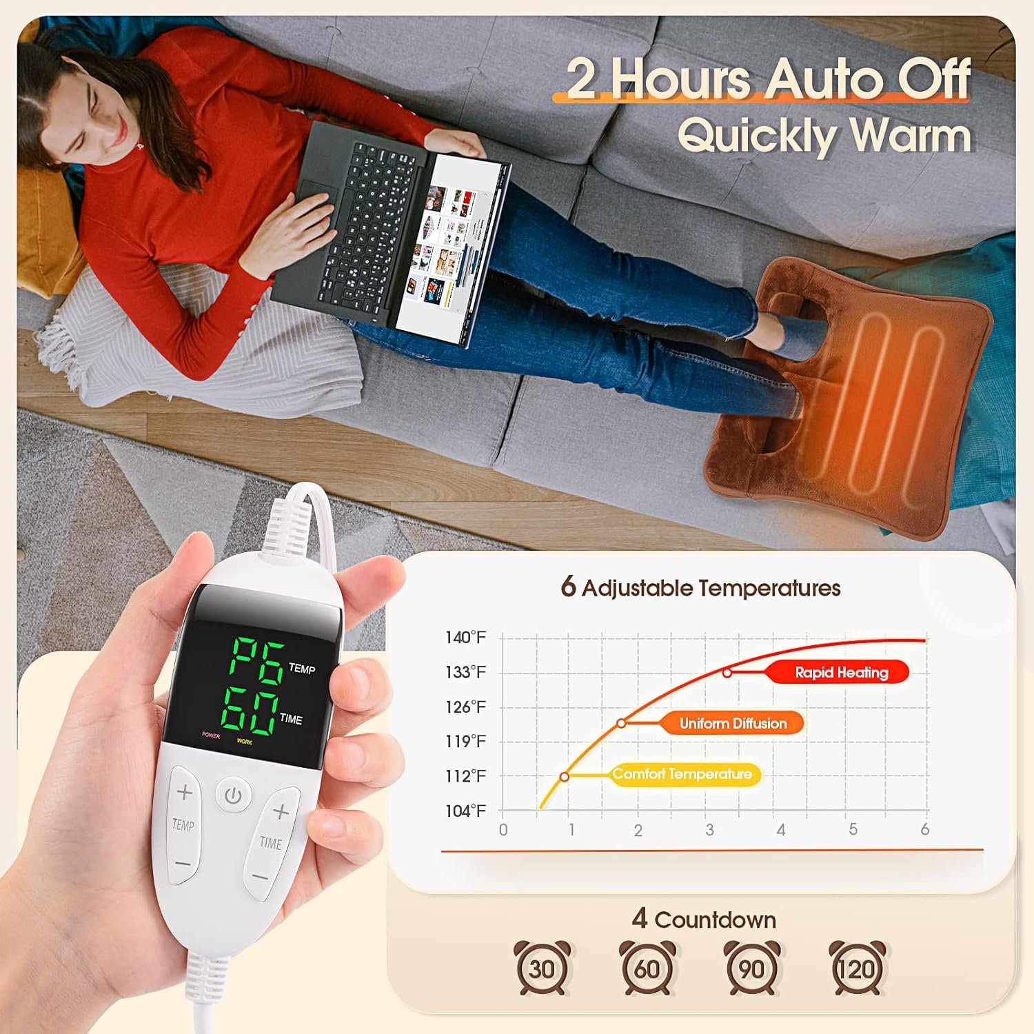 Sleep with peace of mind throughout the night thanks to the four levels of intelligent timing provided by this foot warmer. With options ranging from 30 to 120 minutes, you can set the desired duration and let the electric foot warmer turn off automatically. This feature not only ensures your safety but also helps save energy.
