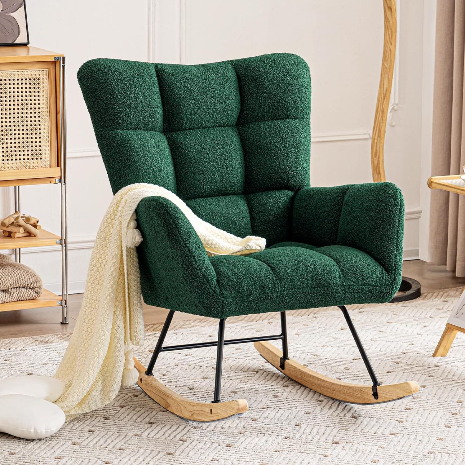 Furniliving Modern Rocking Chair Nursery, Sherpa Rocking Accent Chair with Thicken Cushioned Seat, Glider Chair for Nursery, Upholstered Comfy Chair for Living Room,Bedroom(Green)