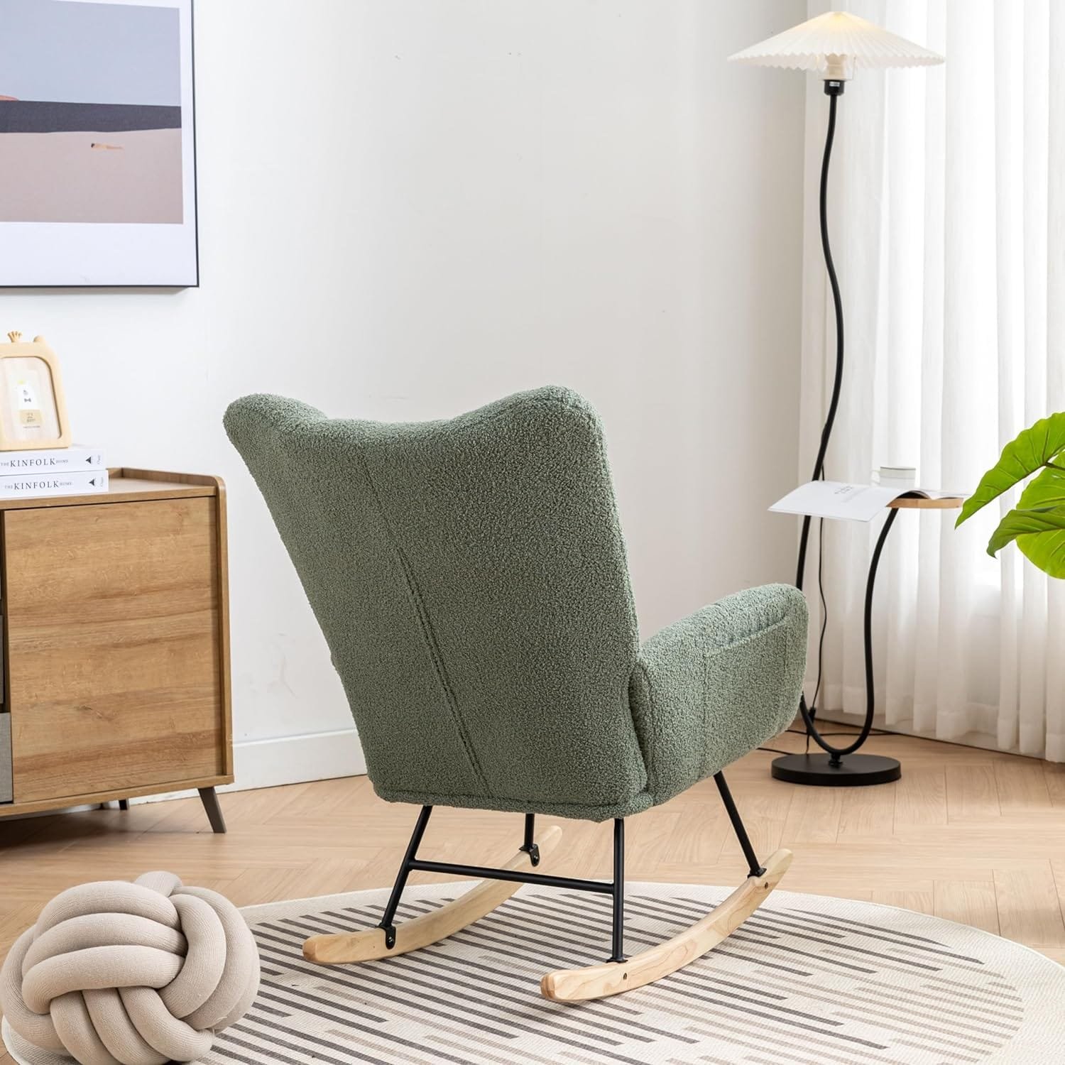 Experience true comfort and style with the Livavege Rocking Chair. This modern and elegant chair is upholstered in soft teddy velvet fabric, providing a luxurious feel and ensuring breathability. With its high wing backrest and padded seat, the chair offers optimal support and seating comfort. The ergonomic design of the curved back and armrests ensures that you can sit for long periods without experiencing back pain. Additionally, the chair features a gentle rocking motion, perfect for relaxation or soothing a baby to sleep. Its sturdy and durable structure, with a solid wood bottom and metal frame, ensures stability and longevity. Whether for your baby nursery, living room, bedroom, balcony, or office, this rocking chair is a perfect addition to any space. Plus, assembly is effortless, with all the necessary hardware and tools provided. Upgrade your seating experience and bring a touch of modern elegance to your home with the Livavege Rocking Chair.