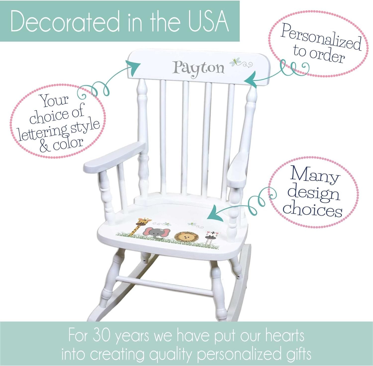The My Bambino rocking chair is built to last from high-quality real wood and is painted white for a timeless look. It passes all national child safety tests and is certified lead-free and non-toxic, ensuring the safety of your child while they enjoy their rocking chair. The use of non-toxic, permanent inks for the personalization further enhances the safety aspect of this product.
