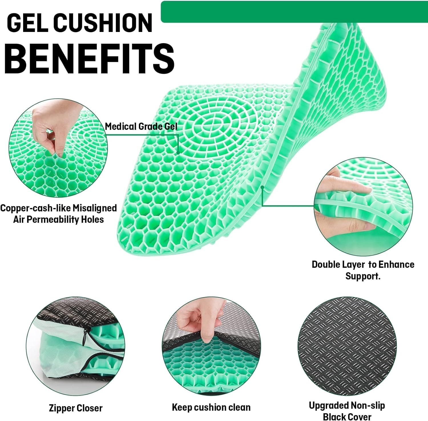 The gel seat cushion comes with an ice-silk, machine-washable, zippered, non-slip fabric cover, making it easy to clean. Additionally, the cushion is portable and can be easily taken out of the cover, allowing you to use it in your office, wheelchair, car, truck, stadium, or even in a movie theater.
