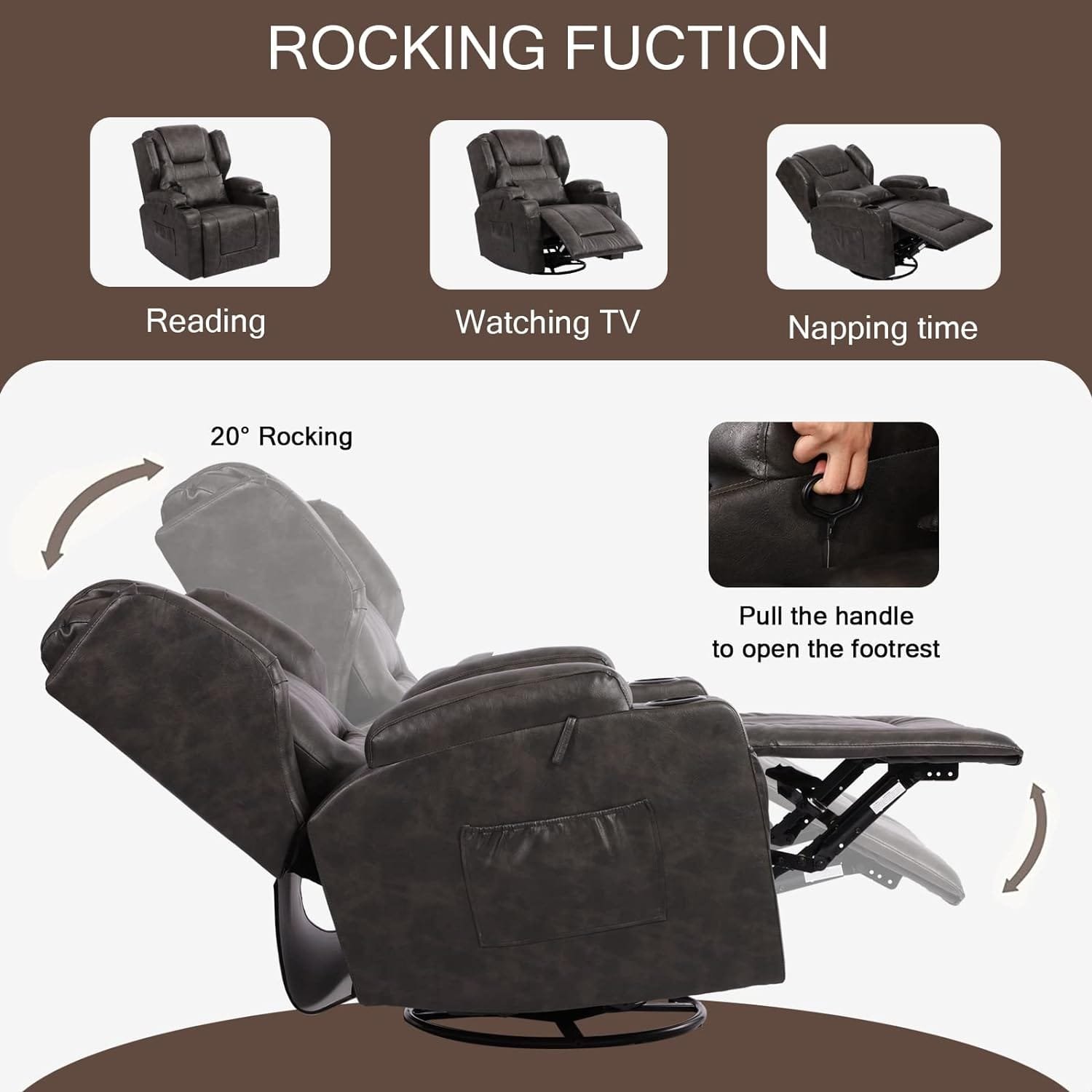 This recliner chair is also perfect for home theaters. With its 360-degree swivel function and convenient storage options, you can easily access snacks, drinks, and remote controls without getting up. The cup holders in the armrests provide a secure spot for your drinks, allowing you to enjoy your favorite movies or sports events without any interruptions.